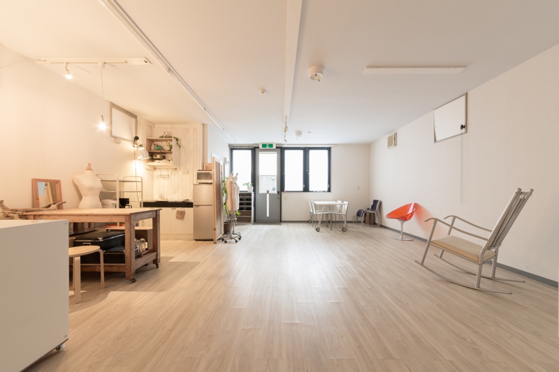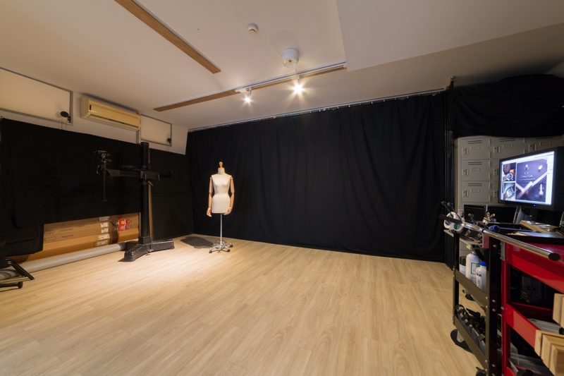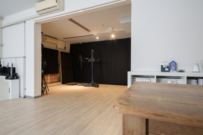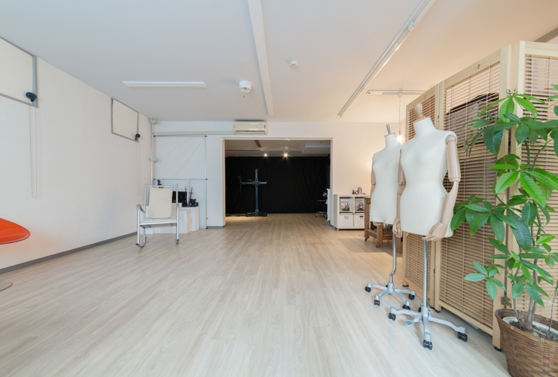 半地下ですが入り口側には窓があるので程よい光が入ってきます。 62平米あり複数の撮影セットを同時に組むことが可能です。 手前部分の天井高は265cm、高さのある商品にも対応可能です。